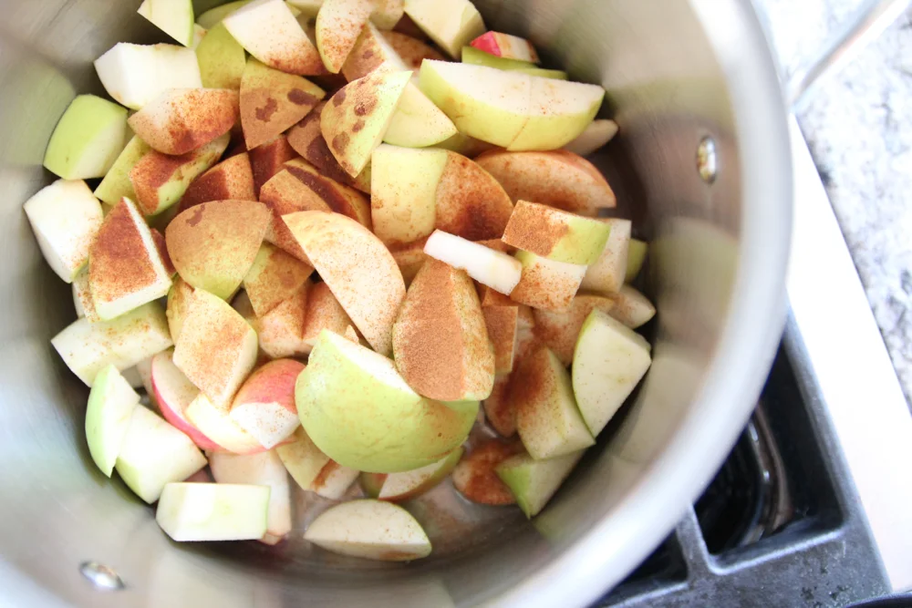 - Peel, core and slice up apples and place them in a pot (*peeling is optional) with cinnamon.