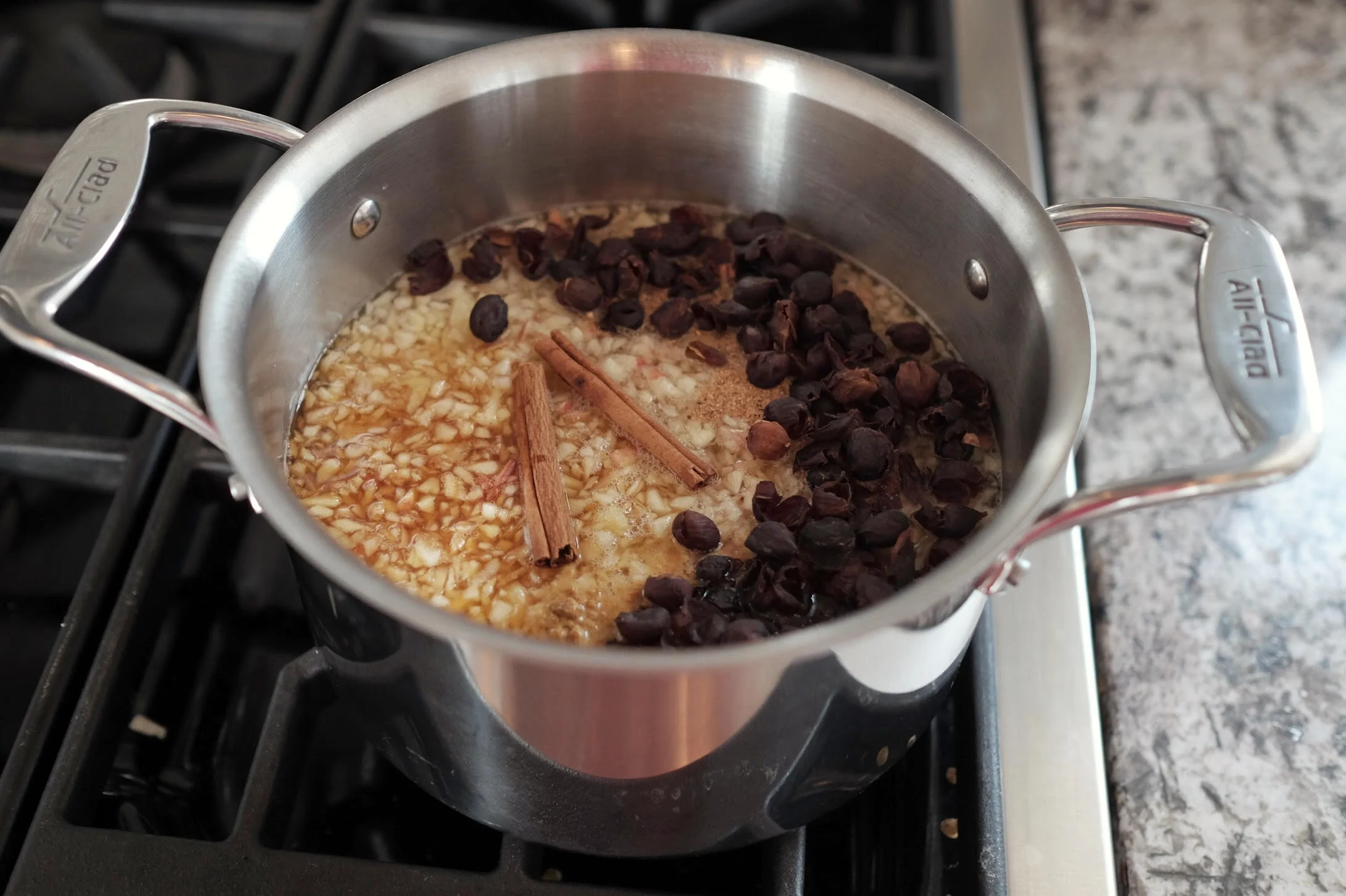 2. Place apples, water, cascara, and spices in a pot. Stir and bring to a boil.
