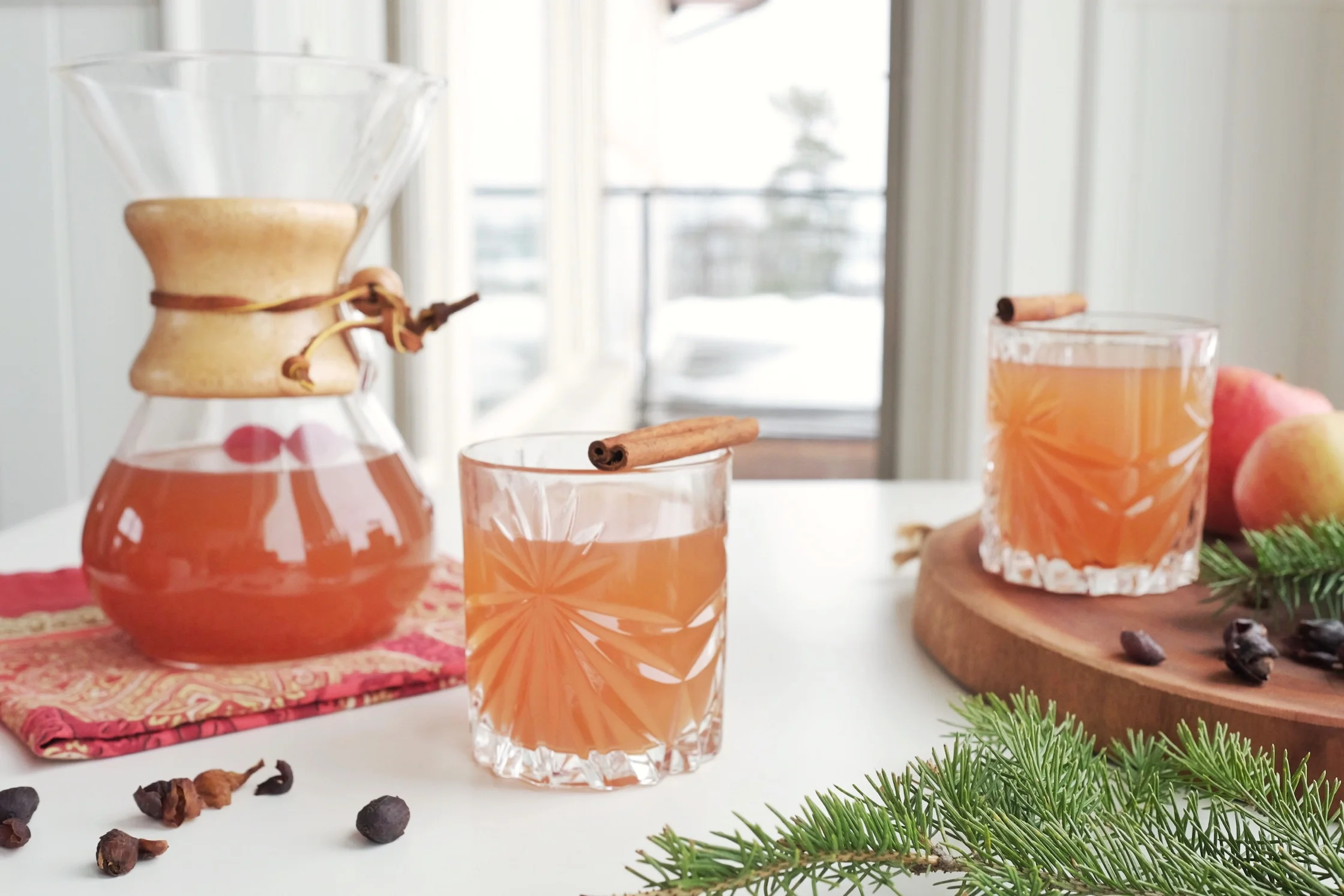 If you have a Chemex, it is a great vessel for both straining and serving the hot cider. Of course you can serve the cider in mugs, but presenting it in glasses allows you to see it's gorgeous color. Check out the video tutorial below...