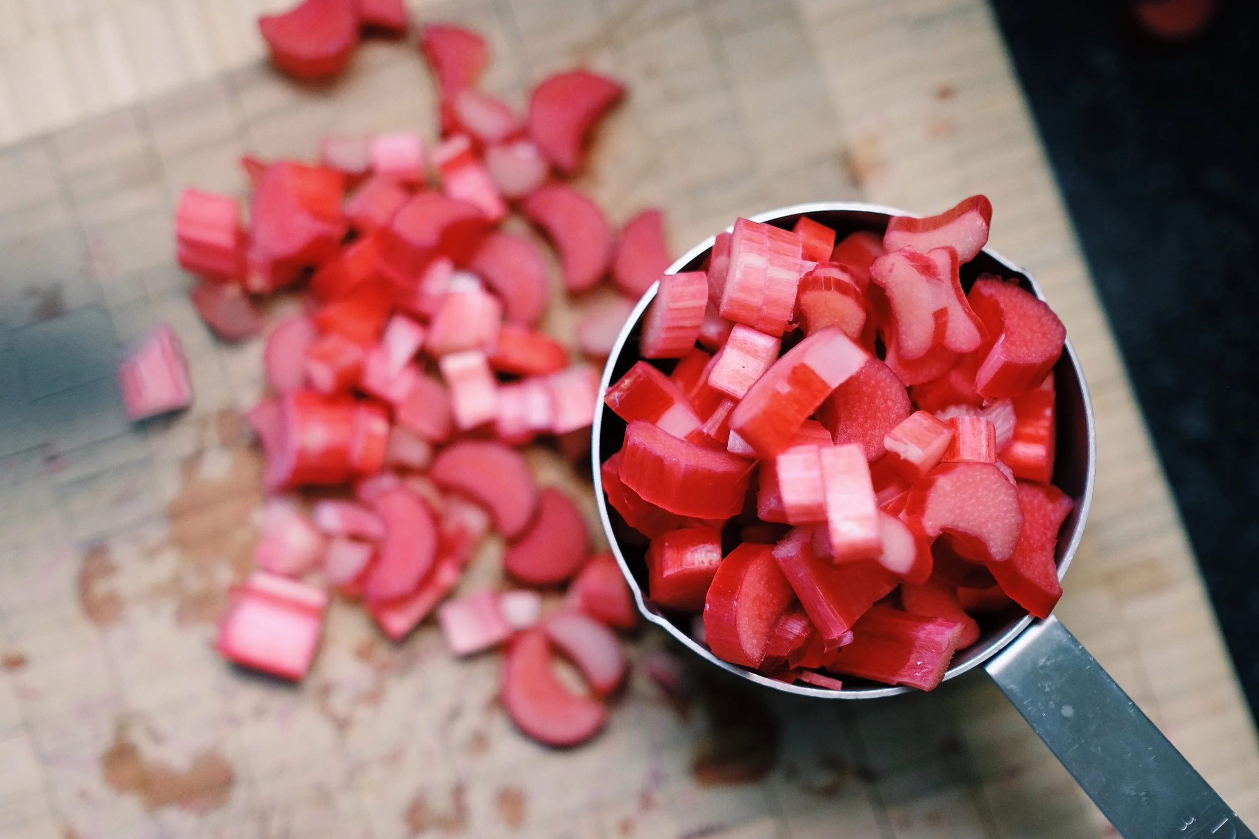- Place chopped rhubarb and strawberries into a small sauce pan and simmer on low for an hour. Stirring occasionally.