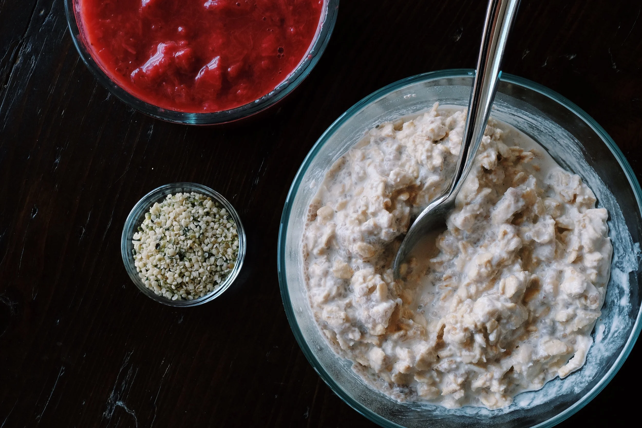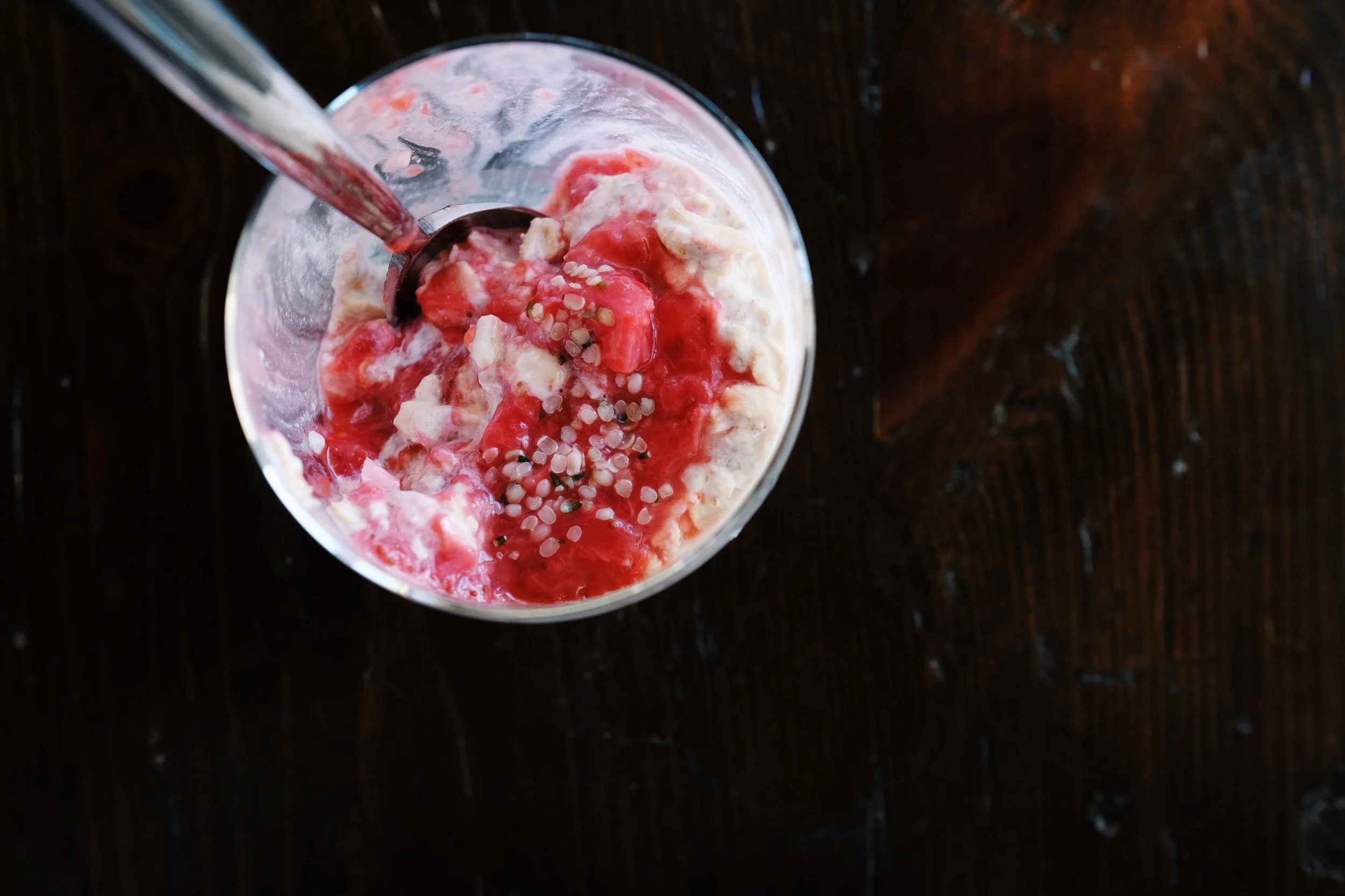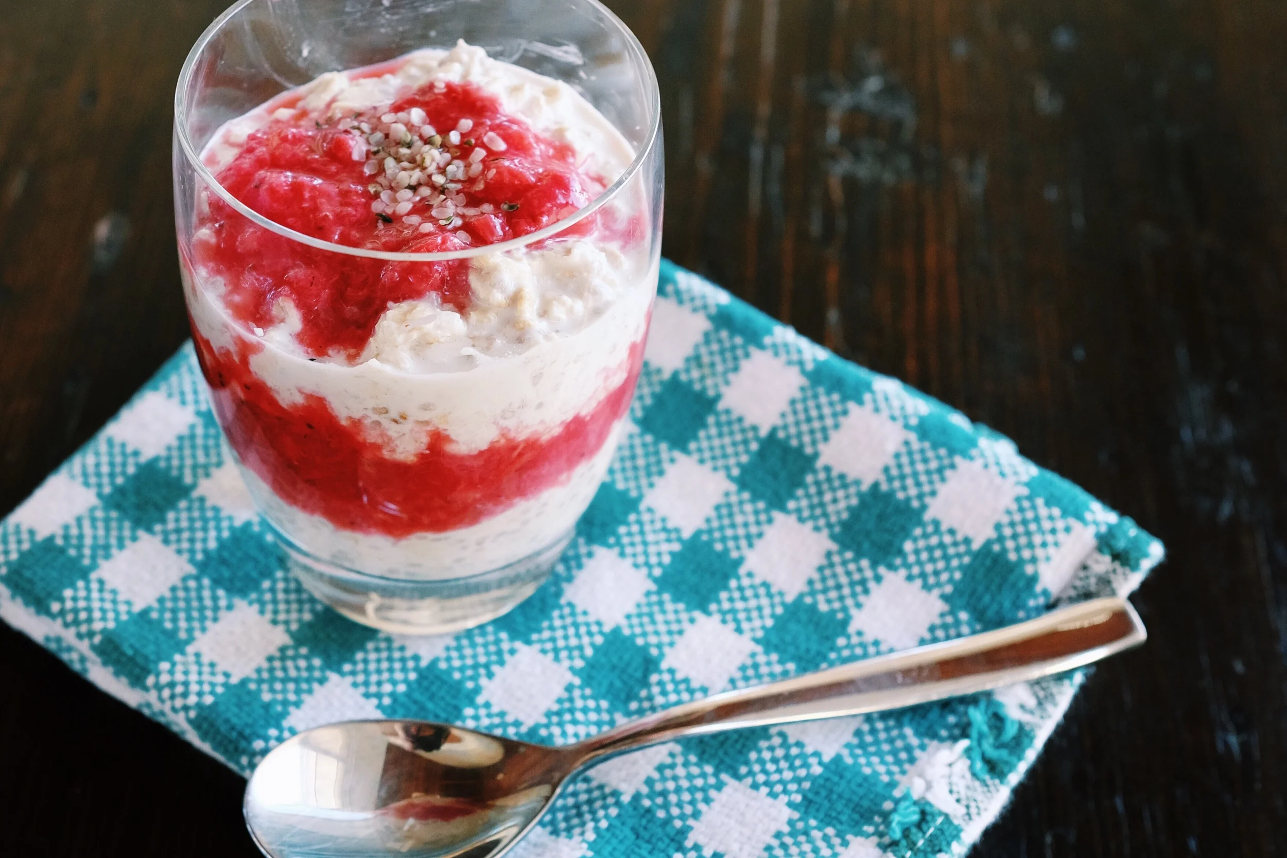 Easy Overnight Oat & Chia Pudding with Strawberry Rhubarb Compote